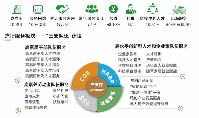 杰博人力,成立于2008年,總部位于浙江省寧波市,始終秉持“賦能產(chǎn)業(yè)、成就人才”的使命,致力于成為一家顧問式、綜合性的人力資源服務(wù)機(jī)構(gòu)。為客戶提供:招才引智、管理咨詢、培訓(xùn)賦能、人才測(cè)評(píng)、人才背調(diào)、人才獵尋、項(xiàng)目申報(bào)、產(chǎn)教融合、退役軍人軍嫂就業(yè)賦能、靈活用工、勞務(wù)派遣、招聘流程外包、業(yè)務(wù)外包、福利定制等服務(wù)。